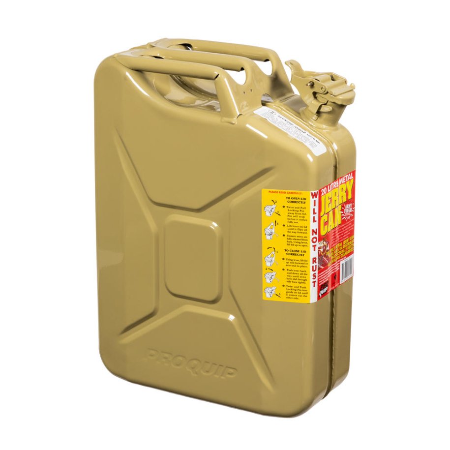 Proquip 20L Olive Yellow Metal Diesel Fuel Jerry CanPro Quip are the toughest, safest, and most thoroughly tested in Australia and the world. Made in Europe, used by defense, fire and emergency services, government departments and everyday Australians alike. Don't waste your money on inferior cheap copies that offer only short-cuts in design, quality and finish.\tTraditional style closure ÔÇô WW2 German bayonet design\tPatented secondary locking pin\t0.9mm cold rolled steel construction\tHeavy duty external powder coating\tFuel resistant internal coating\tSuitable for use with all pump fuels\tUpright military design is easy to store, easy to pour and easy to handle\tAFAC approved colour for fuel storage identification