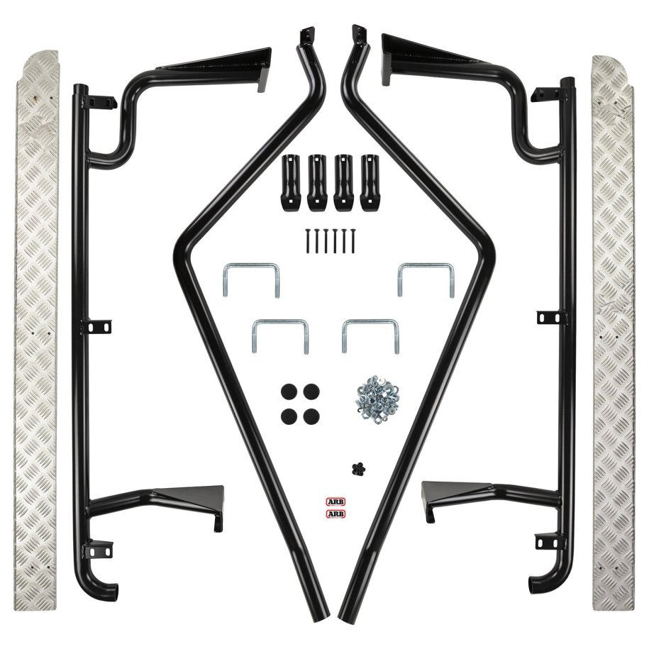 DELUXE SIDE RAIL & STEPDesigned and manufactured to ensure compatibility with side airbags and modern vehicle safety systems, ARB's deluxe range of side protection products will provide added protection for your vehicle from obstacles small and large, whilst the steps provide easier access to your vehicle.Superbly engineered bolt-on chassis mounting systems distinguish ARB side protection gear from the standard steps commonly fitted to 4WDs. Manufactured for fitting to Deluxe bull bars:\thigh strength 47.6mm steel tube, mandrel bent\tbolt-on chassis brackets\tbolt-on bar clamp, three-bolt steel clamshell type\talloy tread plateThis side step and side rail is a complete set.