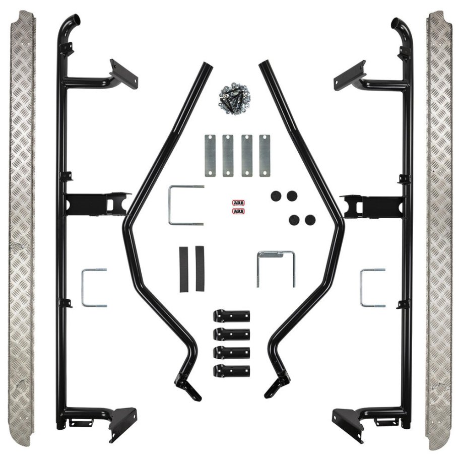 DELUXE SIDE RAIL & STEPDesigned and manufactured to ensure compatibility with side airbags and modern vehicle safety systems, ARB's deluxe range of side protection products will provide added protection for your vehicle from obstacles small and large, whilst the steps provide easier access to your vehicle.Superbly engineered bolt-on chassis mounting systems distinguish ARB side protection gear from the standard steps commonly fitted to 4WDs. Manufactured for fitting to Deluxe bull bars:high strength 47.6mm steel tube, mandrel bentbolt-on chassis bracketsbolt-on bar clamp, three-bolt steel clamshell typealloy tread plateThis side step and side rail is a complete set.