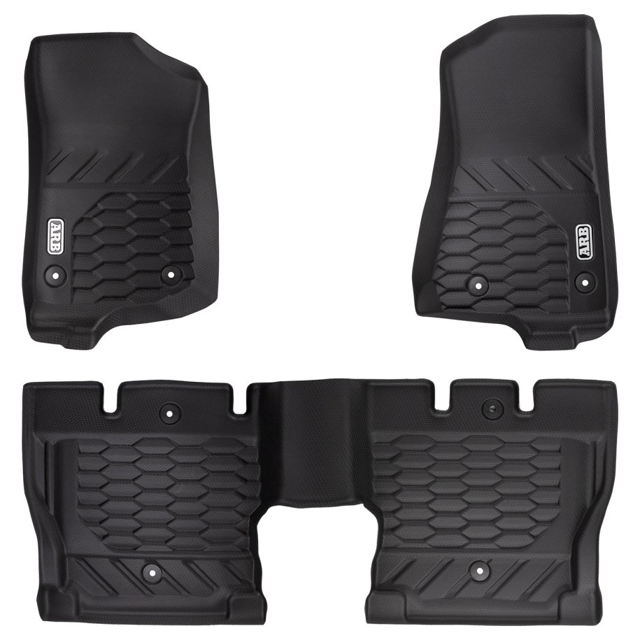 ARB FLOOR MATS Designed by ARB with an engineered 2-stage floor protection system that captures dirt, debris and water. The designated catchment areas in the floor mat is designed to capture any foreign material which provides complete protection to your vehicles floor. The second stage provides drainage channels which directs moisture to an additional catchment zone thereby preventing slippage while driving.Features & Benefits:• Vehicle and model specific• 100% waterproof and simple to clean• 3D moulded to each vehicle for a perfect fit every time• Made from thermoplastic elastomers that provide all the benefits of rubber without the odour• Two-stage design for secure foot placement, reduced spillage and complete protection• Unique surface texture designed and moulded for a secure grip over the entire surface• Seamless edging to integrate with vehicle's interior• OEM-compatible safety retention clips• Engineered debris channels that disburse material towards catchment zones• Includes one driver mat, one passenger mat and a full single rear mat CLEANINGARB Floor Mats are 100% waterproof and are designed to capture all kinds of debris from sand and dirt to mud and snow. The moulded deep dish design can be easily cleaned. Simply wipe or hose off any debris, dry and then place back in the vehicle ready for the next adventure.
