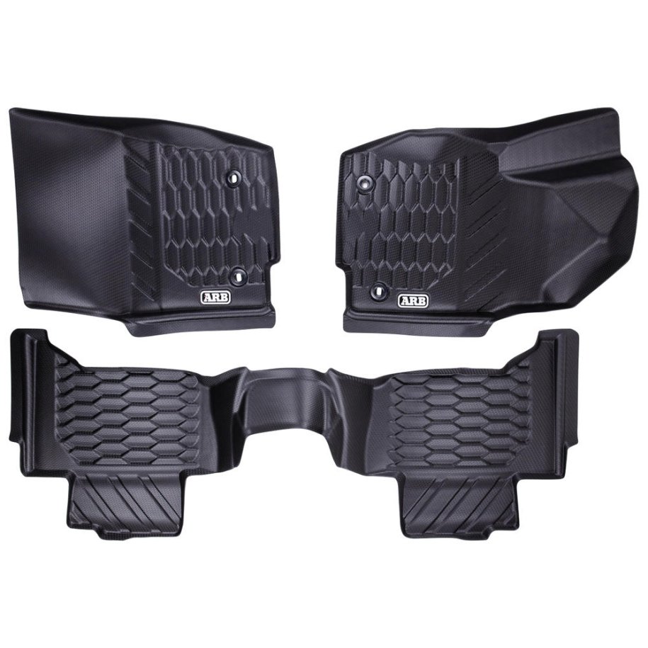 ARB FLOOR MATS Designed by ARB with an engineered 2-stage floor protection system that captures dirt, debris and water. The designated catchment areas in the floor mat is designed to capture any foreign material which provides complete protection to your vehicles floor. The second stage provides drainage channels which directs moisture to an additional catchment zone thereby preventing slippage while driving.FEATURES:• Vehicle and model specific• 100% waterproof and simple to clean• 3D moulded to each vehicle for a perfect fit every time• Made from thermoplastic elastomers that provide all the benefits of rubber without the odour• Two-stage design for secure foot placement, reduced spillage and complete protection• Unique surface texture designed and moulded for a secure grip over the entire surface• Seamless edging to integrate with vehicle's interior• OEM-compatible safety retention clips• Engineered debris channels that disburse material towards catchment zones• Includes one driver mat, one passenger mat and a full single rear mat CLEANINGARB Floor Mats are 100% waterproof and are designed to capture all kinds of debris from sand and dirt to mud and snow. The moulded deep dish design can be easily cleaned. Simply wipe or hose off any debris, dry and then place back in the vehicle ready for the next adventure.