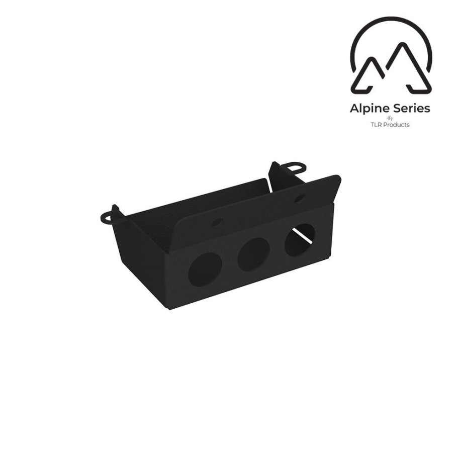 ALPINE SERIES BUTTON\/SWITCH MOUNT, SUITS ALPINE SERIES STORAGE SHELF The TLR Products Triple 19mm Switch Mount is a compact, purpose-built bracket designed to hold up to three 19mm switches or buttons, such as those from Billet Buttons.Perfect for cleanly installing accessories like lights, fridges, air compressors, or custom functions, this mount gives you a neat, accessible control panel. This Product is part of the ÔÇ?Alpine SeriesÔÇ? and integrates along to front edge of the TLR products storage Shelf.FEATURES: \tLaser cut from 1.50mm Zinc Coated steel \tPowder coated in a highly durable black textured finish for additional corrosions resistance and aesthetics.
