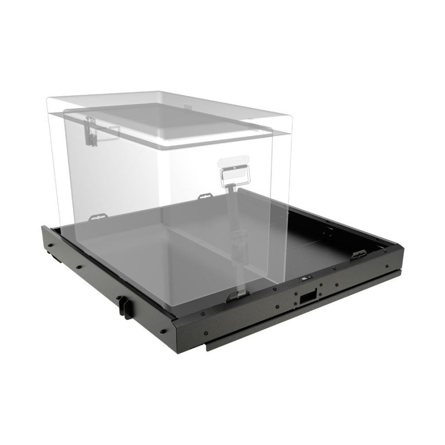 This “flat drawer” can hold a refrigerator along with chairs, cargo boxes, and other gear. Or it can simply be used to easily access groceries and other everyday items.Secure up to a 52L (or equivalent) size fridge, with additional room for storage -- such as the Front Runner Wolf Packs or Cub Boxes, tents, chairs, camp kitchen items, tool kits, etc. Mounts to the existing tie down points in the bed of the JKU and does NOT REQUIRE DRILLING into your 2011 + Jeep Wrangler JKU. “Push to close” dual latching lock securely keeps the unit closed and rattle-free. Works with the factory Sub Woofer in place. When extended, 100% full access to the storage cubby. Features multiple tie down points for Stratchits or many other style straps. Load Rating: 113 kg / 250 lbs.