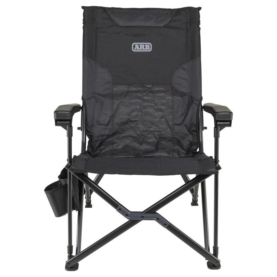 ARB PINNACLE CAMP CHAIRThe ARB Pinnacle Camp Chair offers a premium seating experience when travelling. It features a sturdy, sleek black steel frame with contrasted charcoal brackets and a quick release bracket on the rear, making it easy to fold down when you're ready to pack up. The body of the chair is made from 600D polyester and 420D ripstop panels and features a tonal print and internal padding throughout. The wide armrests provide ultimate comfort when in use. There is an abundance of storage for your essentials with a rear mesh pocket and built in side panel featuring a cup holder and additional pockets.