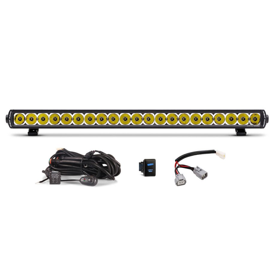 BEHIND GRILL LIGHT KIT, 28 INCH LIGHT BAR, INCLUDES WIRING LOOM AND SWITCHTake your Suzuki Jimny's night-driving capability to the next level with a stealthy and powerful lighting upgrade. The Night Hawk Behind Grille Light Bar kit is designed specifically to mount neatly behind the lower grille and provide a factory look with plug & play wiring loom, paired with an OEM style switch. This setup delivers greater illumination over the factory high beams without compromising the Jimny's styling. The 28ÔÇ? light bar provides an impressive spread and distance making it perfect for off-road exploration or rural night driving. The installation is straightforward with vehicle-specific, body mounted brackets that require only minor trimming to the plastic lower radiator sh