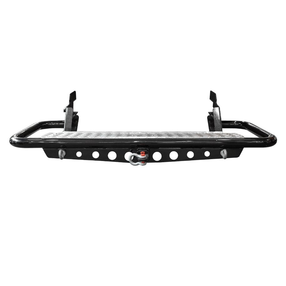 DELUXE REAR STEP TOW BARARB's Rear Step Tow Bars for utility vehicles are a towing system that provide a massive amount of protection for vulnerable rear panels.Using an extremely strong, vehicle specific mounting system, the rear step tow bar will withstand immense off road punishment, whilst allowing for improved access to the tub and roof of the vehicle.Like all ARB protection equipment, the product is finished in a durable powder coat, which doubles as an excellent base for colour coding.Features:\tCLASS 4 TOW HITCH: A 50mm hitch is supplied as standard to maintain the 3.5T rating of the Rear Step (subject to vehicle tow rating - whichever is the lower value).\t \tTREAD PANEL: An aluminium checker plate for grip and safety when accessing the vehicle tub or roof.\t \tTOWING POINTS: M20 eye bolts are supplied for light towing applications. Note: Eyebolts are not designed or rated for vehicle recovery.