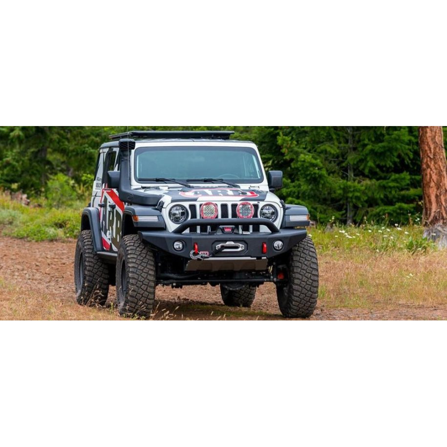 ARB BONDI DELUXE BUMPER Inspired by the popular classic ARB TJ Wrangler bumper styling, ARB has designed a completely new look bumper to suit the JL. Ruggedness is ensured by the new single piece, press formed centre pan perfectly complemented by a bash plate underpanel. Further protecting the vulnerable engine components is a low slung, forward facing 76.1mm top tube.The new Bondi Deluxe Winch bar is recovery ready with two highly visible red chassis mounted, 8T rated recovery points and centrally located high lift jacking points.FEATURES: Vehicle specific design to complement the Jeep Wrangler JLDurable steel construction for maximum protectionSingle-piece press formed centre panBash plate under panel included for added protection finished in vintage silverTwin high lift jack points in the bar perfect for use with ARB Jack or a mechanical jackTwo aerial or driving light brackets located on the top of the centre tubeWill accommodate Warn, Bushranger and Smittybilt low mount model electric winches up to 10,000lbsProvision to accommodate ARB Intensity LED's and a range of Bushranger lightsProvision for OE Fog Lights. Refer fog light section below for additional parts required Brackets provided to accept either OE halogen or OE LED fog lightsDual chassis-mounted recovery points, powder-coated red for maximum visibilityBumper adds approximately 34mm to the overall length of the vehicleApproximate weight of the bumper, chassis mounts and fitting kit is 143lbsApproximately 42lbs is removed from the vehicle for fitment of the barZinc rich primer for additional corrosion resistance, followed by a textured Integrit black powder coat finishChassis mounts manufactured with 5mm sheet steelSeparate winch cradle manufactured from a combination of 4mm and 5mm sheet steel76.1mm forward-facing top tubeWings and pan manufactured from 3mm sheet steel including press forms and multi folds for added structural integrityWings designed to suit the flares of Rubicon models will also suit Sport and Sahara models with Rubicon or aftermarket front flares fittedUprights manufactured from laser-cut 4mm sheet steelFog light brackets provided to accept either OE halogen fog lights or OE LED fog lights